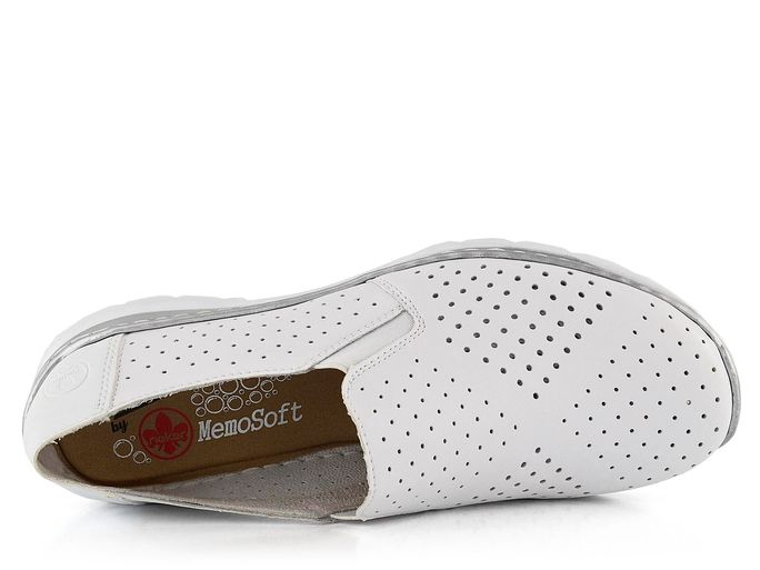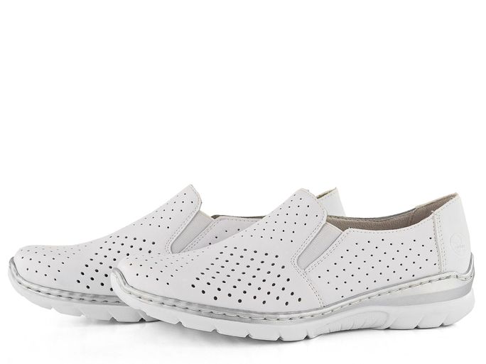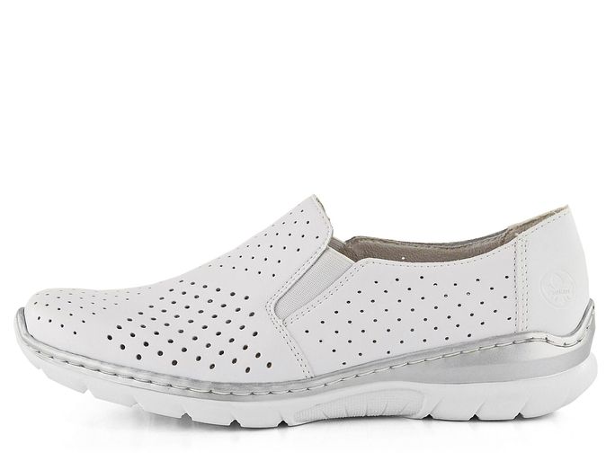Elegantní a pohodlné dámské prozouvací polobotky značky Rieker v oblíbené bílé barvě jsou ideální volbou pro jarní a letní sezónu. Tyto boty se vyznačují kulatým střihem a jsou vyrobeny z kvalitní povrstvené kůže, která je lehce odražená. Perforace na bocích a špičce zajišťuje vynikající prodyšnost, což oceníte zejména v teplých dnech.