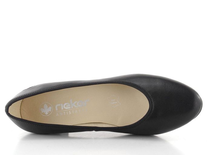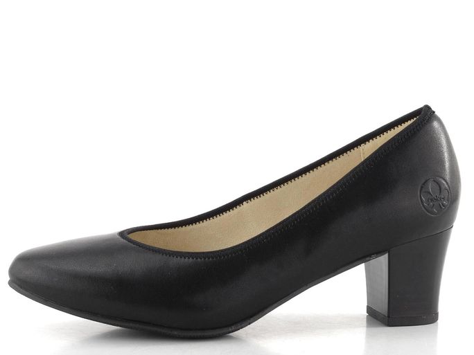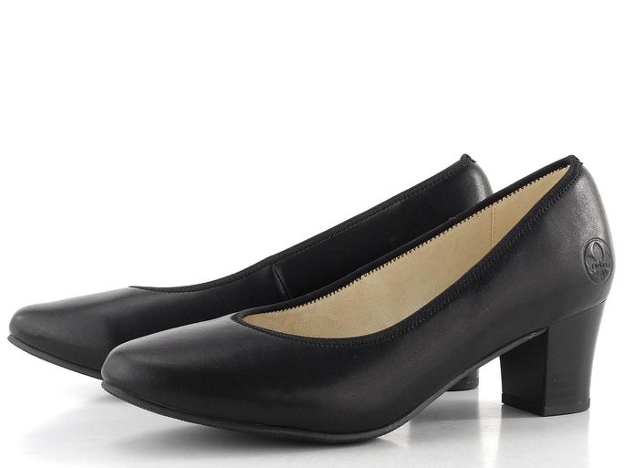 Pohodlí a elegance se snoubí v těchto komfortních dámských lodičkách od značky Rieker. Jejich kulatá špička a černá barva dodávají šmrnc, zatímco svrchní materiál z hladké kůže zajišťuje trvalou kvalitu. Pružná paspulka v obvodu zvyšuje komfort nošení, a textilní podšívka spolu se měkkou stélkou ze zabroušené kůže poskytují příjemný pocit po celý den. S pevnější syntetickou podešví a širokým podpatkem o výšce 5,5 cm se můžete cítit sebevědomě a pohodlně při každé příležitosti, ať už v kanceláři, nebo na slavnostním večeru. Tyto lodičky jsou ideální volbou pro podzim a zimu.