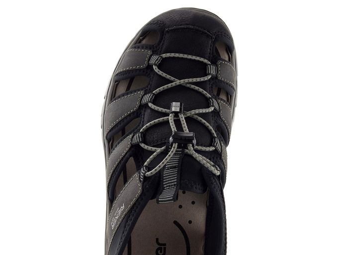 Pro letní dny jsou ideální pohodlné pánské sandály od značky Rieker. Tyto sandály se vyznačují sportovním a pohodlným střihem, který oceníte při každodenním nošení. Svršek je vyroben z kombinace matného syntetického materiálu a textilie, což zajišťuje odolnost a komfort. Černá barva je doplněna o antracitově šedé detaily a světle šedé šněrování, které dodává sandálům moderní vzhled.