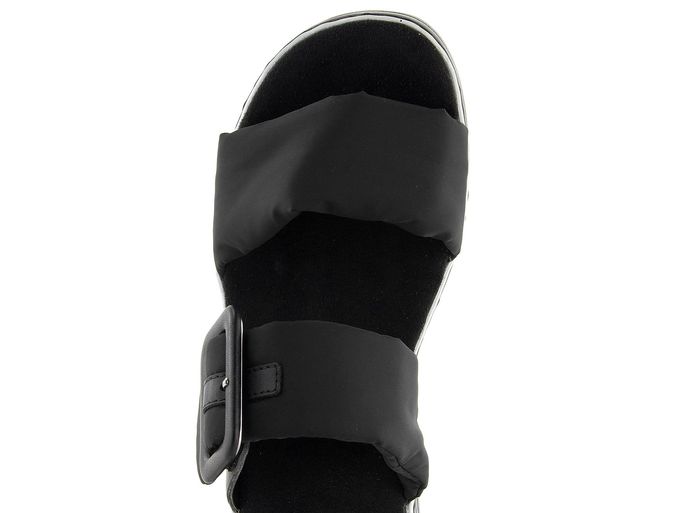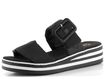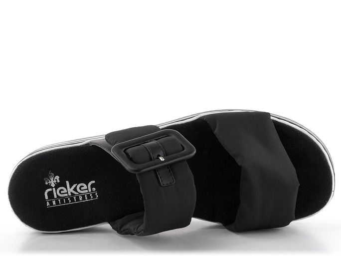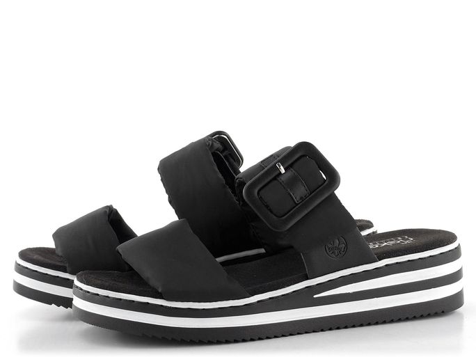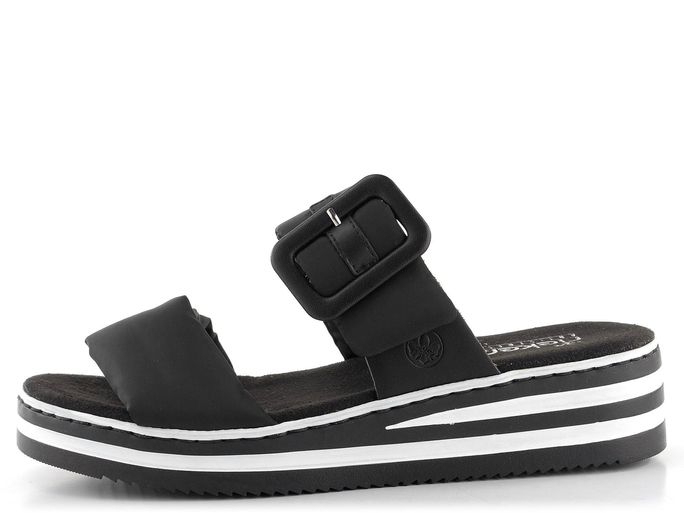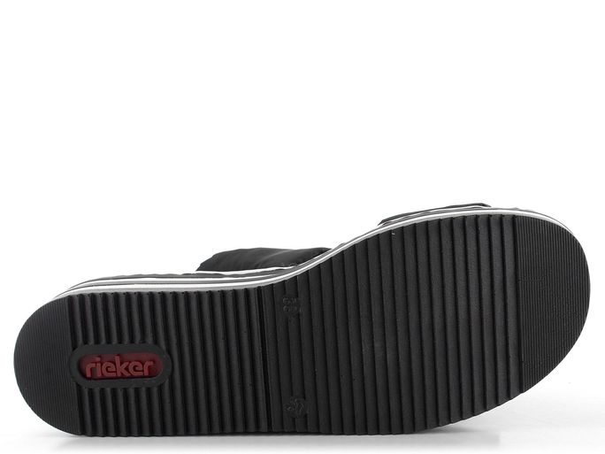 Dámské pantofle na klínku od značky Rieker jsou ideální volbou pro jaro a léto. Tyto pantofle kombinují komfortní kulatý střih s moderním designem. Pásky jsou vyrobeny z textilie a syntetiky, což zajišťuje jejich měkkost a pohodlí. V černé barvě s dekorativní sponou a upínáním na suchý zip působí elegantně a prakticky. Stélka potažená broušenou textilií dobře saje vlhkost, což přispívá k celodennímu komfortu. Vysoká platforma s klínkem, zdobená černobílými proužky, dodává botám moderní vzhled a zajišťuje stabilitu. Pantofle jsou vyrobeny šitým výrobním způsobem, což zaručuje jejich dlouhou životnost. Tento model je ideální pro každodenní nošení do města, kanceláře nebo na lehké procházky.