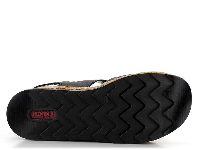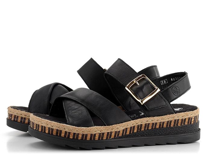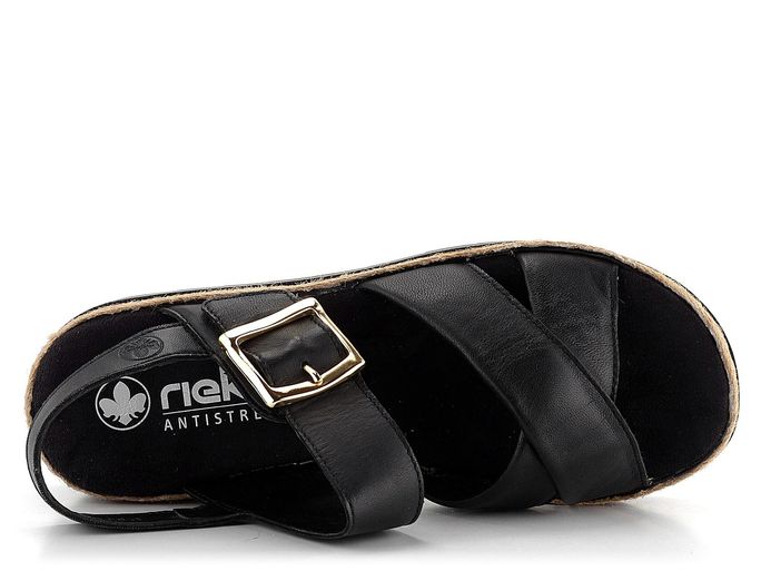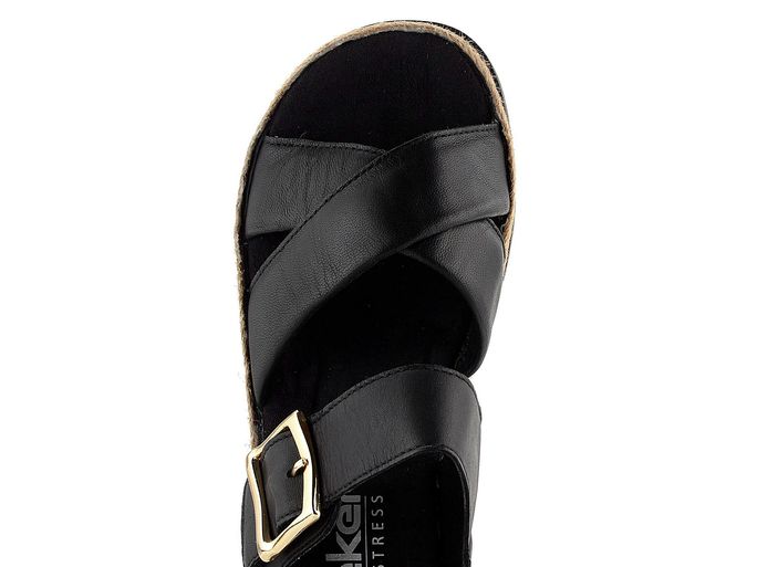 Objevte komfort a eleganci s dámskými koženými sandály od značky Rieker. Tyto sandály jsou perfektní volbou na jaro a léto, díky svému propracovanému designu a kvalitním materiálům. Svršek je vyroben z poddajné hladké kůže v černé barvě, což zaručuje dlouhou životnost a stylový vzhled. Přední křížené pásky jsou měkce polstrované, což poskytuje maximální pohodlí při chůzi. Kotníkový pásek je upínán na suchý zip, s dekorativní sponou, což umožňuje snadné a rychlé obouvání.