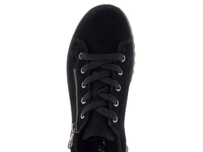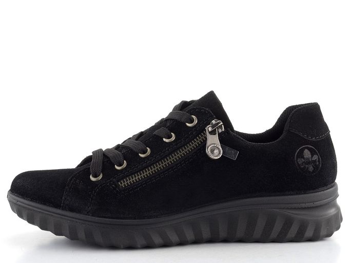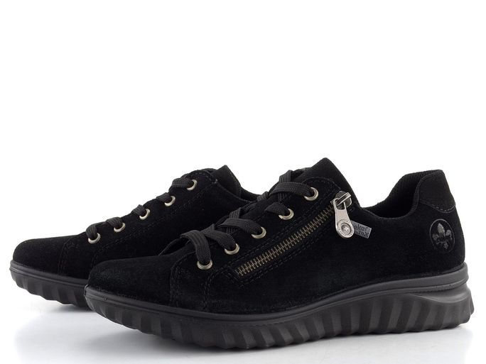 Dámské pohodlné polobotky od značky Rieker jsou ideální volbou pro podzimní a zimní sezónu. Tyto boty vynikají svým prostorným střihem s kulatou špičkou a svrškem ze semišové kůže v elegantní černé barvě. Díky funkčnímu zipu a šněrování se širšími plochými tkanicemi je jejich obouvání rychlé a pohodlné.