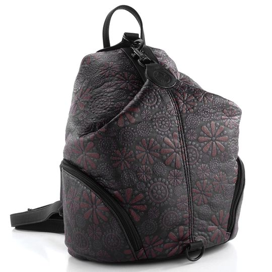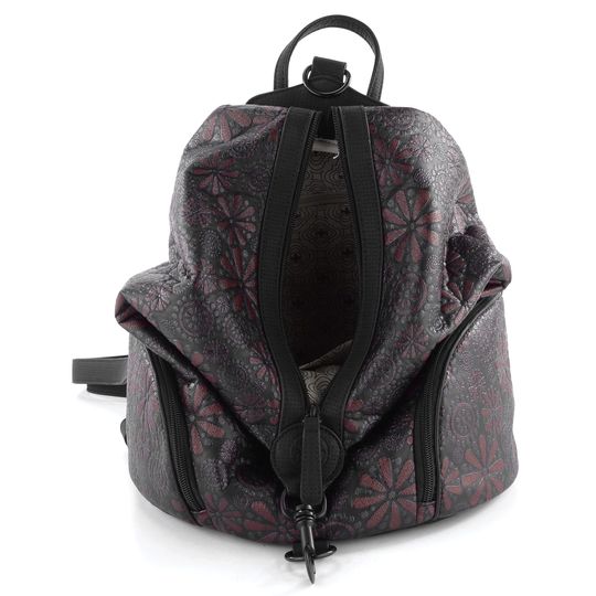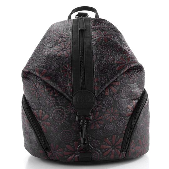 Dámský batoh ve sportovnějším provedení v černé barvě s tmavě vínovým vzorem.
