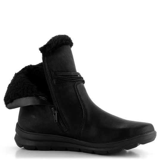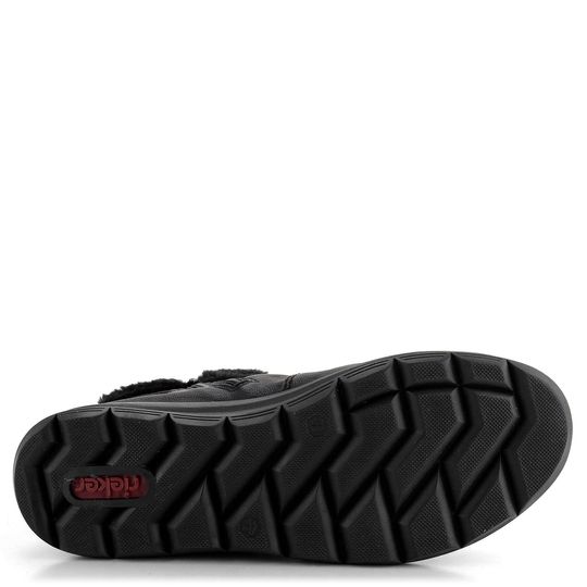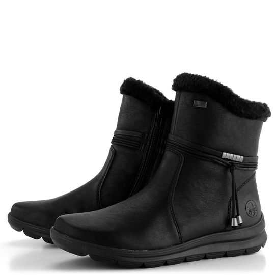 Stylový dámský kotník od značky Rieker je ideální volbou pro chladné zimní dny. Boty vynikají prostornou kulatou špičkou a svrškem z jemně strukturované syntetiky v elegantní černé barvě. Horní lem z hebké textilní kožešinky a zip na vnitřní straně zajistí snadné obutí. Na vnější straně najdete ozdobné pásky s uzlíkem a kovovými koncovkami. Uvnitř vás zahřeje teplá podšívka z umělého beránku. Extra měkká, vyjímatelná stélka s textilním potahem poskytuje komfort díky zesílené patní zóně, perforovanému srdíčku a podpoře podélné nožní klenby. Obuv je vybavena vodoodpudivou membránou riekerTEX® a ohebnou latexovou podešví s hrubým vzorkem. Výška podpatku je 3,5 cm a výška kotníku 15 cm (bez podpatku). Lepený výrobní způsob zaručuje dlouhou životnost. Perfektní volba pro podzim a zimu 2023/24.