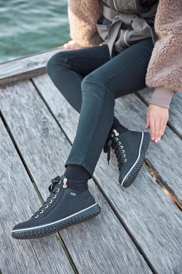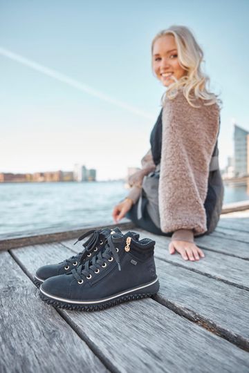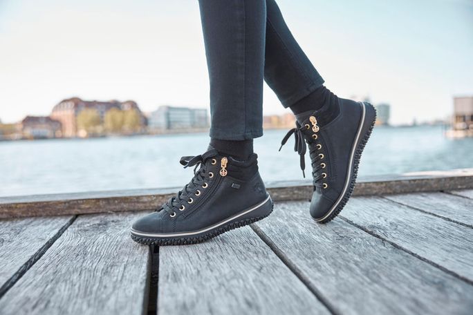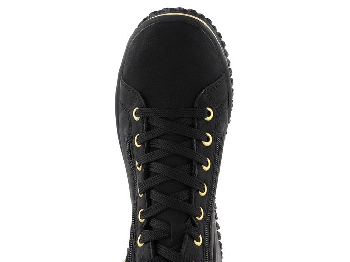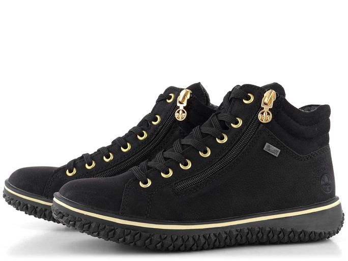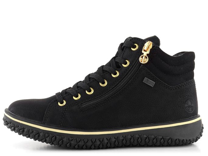 Představujeme vám pohodlný a trendy zimní model dámských kotníkových bot od značky Rieker, ideální pro podzimní a zimní sezónu. Tento sportovnější střih nabízí nejen styl, ale i komfort. Boty jsou vyrobeny z matné dezénované syntetiky v elegantní černé barvě, kterou doplňují světle zlaté prvky. Pro snadné obutí je zde praktické šněrování a postranní zip. Uvnitř najdete teplou filcovou podšívku a filcovou stélku, která udrží vaše nohy v teple. Vyšší bytelná latexová podešev s protismykovým dezénem zajišťuje stabilitu na každém kroku. Výška podpatku je 3 cm a výška kotníku 9 cm (bez podešve). Tento model je skvělou volbou pro každodenní nošení ve městě i na lehké procházky. Vyzkoušejte kvalitu a pohodlí značky Rieker.