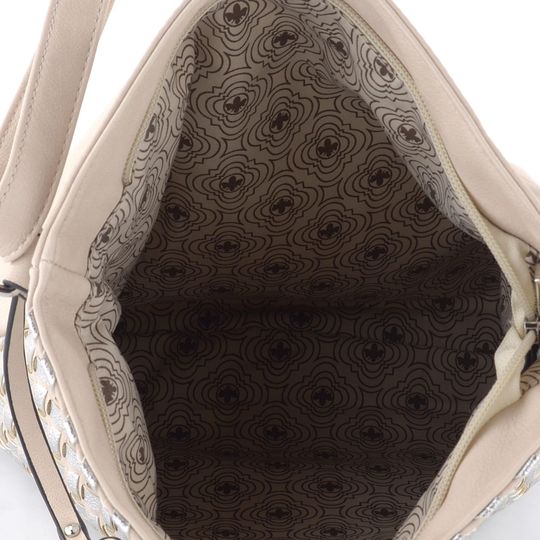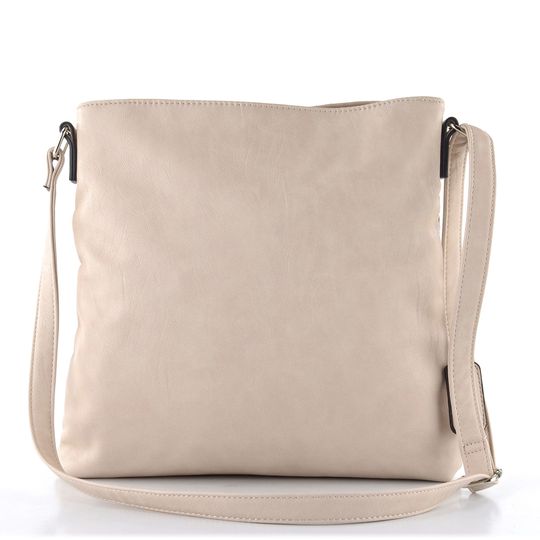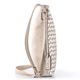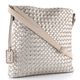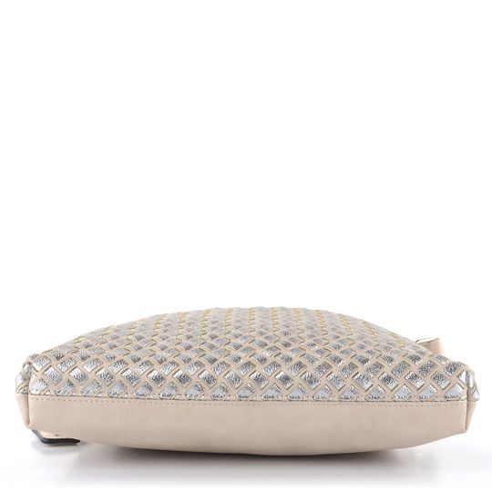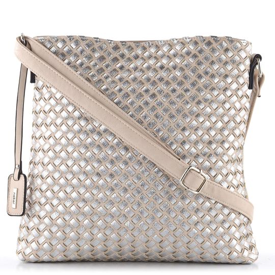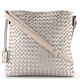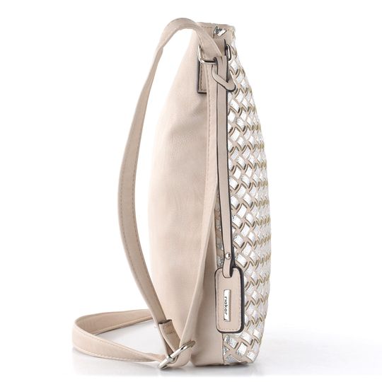 Dámská crossbody kabelka ve světlé béžové barvě s přední stranou z proplétaných metalických pásečků.