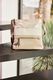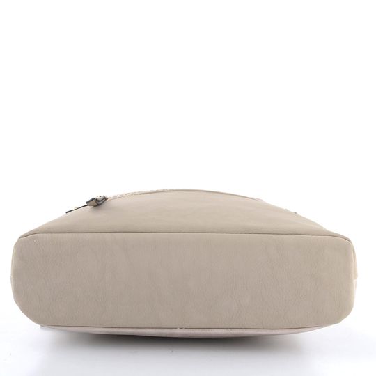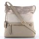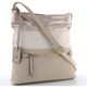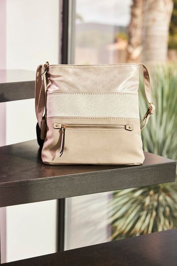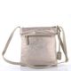 Menší dámská crossbody kabelka kombinovaná z pruhů béžové a krémové barvy.