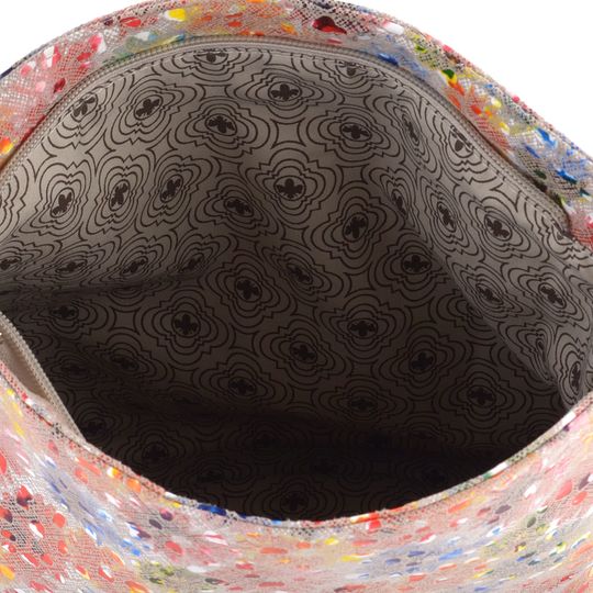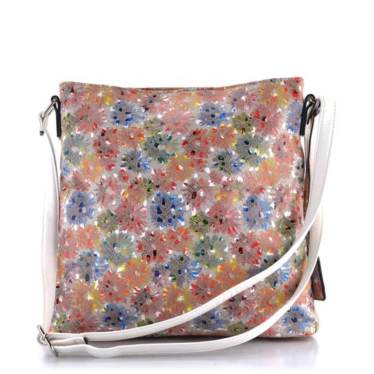 Nepřehlédnutelná dámská crossbody kabelka od značky Rieker je ideálním doplňkem pro jarní a letní sezónu. Tato kabelka zaujme svým pestrobarevným potiskem na bílém podkladě, kde převládají barvy jako červená, oranžová, žlutá, modrá a zelená. Kabelka je vyrobena z poddajné syntetiky s broušenou strukturou sítě a lesklými lakovanými ploškami, což jí dodává jedinečný vzhled.