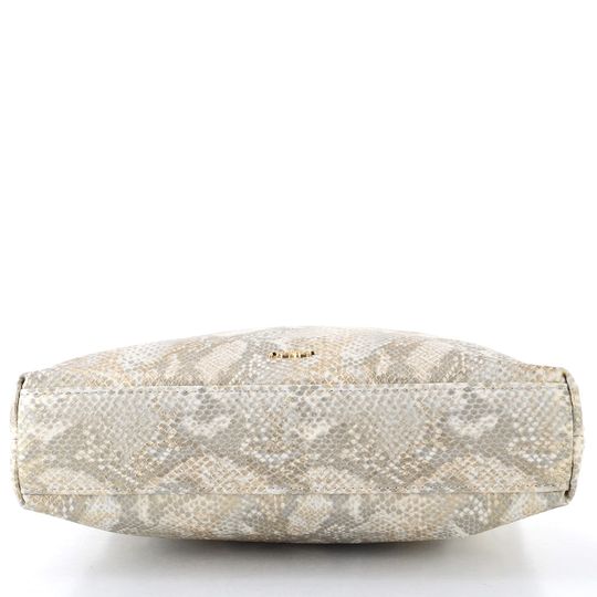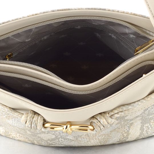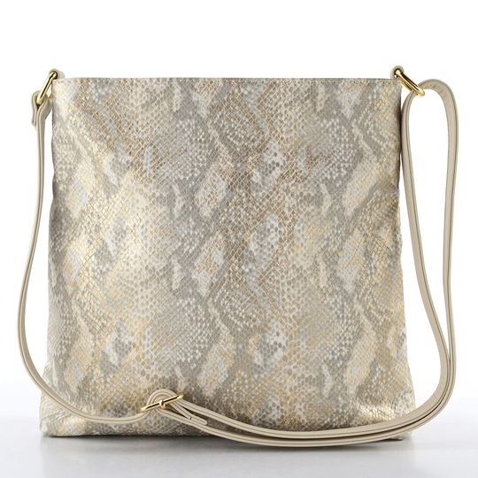 Kabelka od značky Rieker v jemném metalickém provedení je ideálním doplňkem pro jarní a letní sezónu. Její praktická střední velikost a elegantní design s hadinkovým vzorem v béžové barvě se šedými a platinově zlatými akcenty ji činí univerzální volbou pro každou příležitost. Přední strana zdobená kovovou sponou ve zlaté barvě dodává kabelce šmrnc.