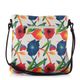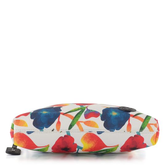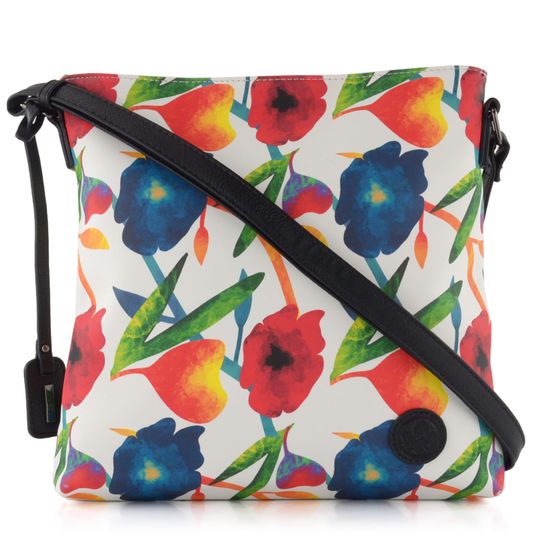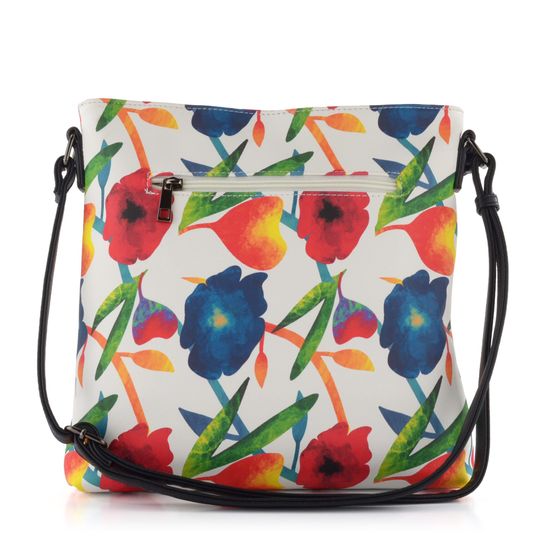 Krásně barevná dámská crossbody kabelka s bílým základem a sytým květinovým potiskem.