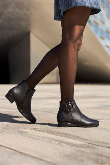 Dámské kotníkové boty od značky Rieker představují ideální volbu pro podzimní a zimní sezónu. S užší kulatou špičkou a výraznou ozdobnou sponou na vnější straně se tyto boty stávají elegantním doplňkem každého outfitu. Svršek z hladké kůže a teplejší vlasová podšívka zaručují pohodlí a teplo i v chladnějším počasí. Snadné obutí zajišťuje zip na vnitřní straně. Nízký široký podpatek o výšce 3,5 cm a ohebná syntetická podešev přispívají k celodennímu komfortu. S výškou kotníku 11,5 cm bez podpatku se tyto boty hodí pro každou příležitost, ať už do města, do kanceláře nebo na formální akce.