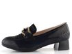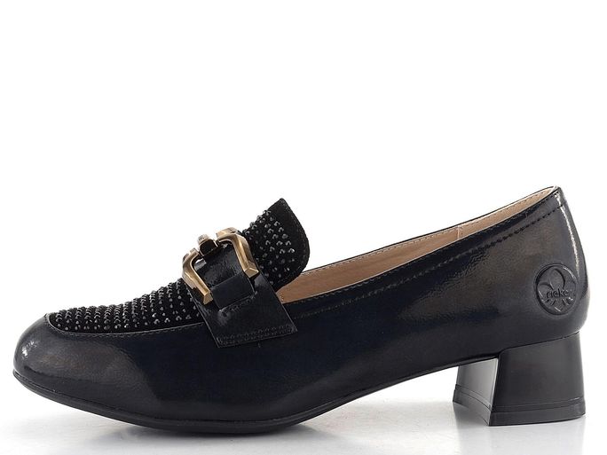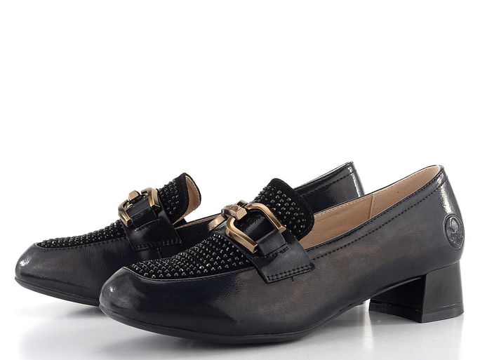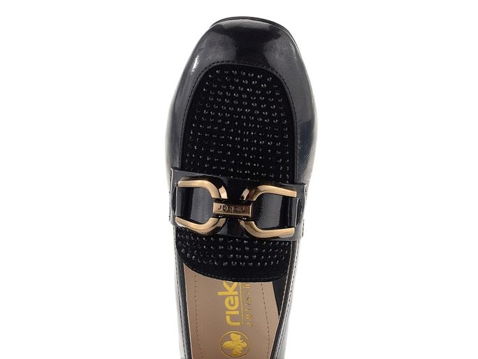 Elegantní lakované polobotky od značky Rieker jsou ideální volbou pro podzimní a zimní sezónu. Tyto boty vynikají svým hranatějším střihem špičky a kombinací lakované a semišové kůže v černé barvě. Semišová špička je zdobena jemnými broušenými kamínky, což dodává botám jedinečný vzhled. Nárt je ozdoben aplikací s názvem značky ve starozlaté barvě. Uvnitř najdete poddajnou celokoženou podšívku a extra měkkou, koženou stélku, která zaručuje maximální pohodlí. Latexová podešev se širokým stabilním podpatkem o výšce 3,7 cm poskytuje bezpečný krok. Tyto polobotky jsou vyrobeny lepeným způsobem, což zajišťuje jejich trvanlivost. Přirozené zvrásnění materiálu při nošení je typickou vlastností, nikoliv vadou. Dopřejte si luxus a komfort s těmito elegantními polobotkami.
