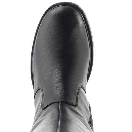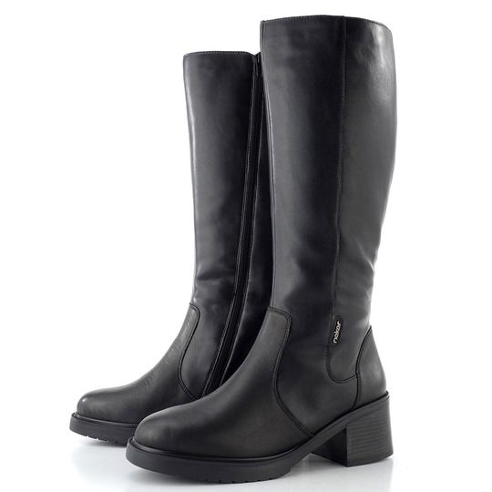 Dámské černé kozačky značky Rieker jsou ideální volbou pro podzimní a zimní dny. Tyto elegantní kozačky na podpatku s výškou 6 cm kombinují hladkou kůži a syntetiku, což zaručuje nejen styl, ale i pohodlí. Kulatý tvar špičky a teplá podšívka z umělého beránku vás příjemně zahřeje. Praktický zip na vnitřní straně a široká pruženka zajistí perfektní padnutí na lýtko, zatímco funkční zip na zadní straně umožňuje rozšíření obvodu. S výškou 37 cm a obvodem 40 cm jsou tyto kozačky vhodné pro širší lýtka L/XL. Pevná latexová podešev s širokým podpatkem přináší komfort při každém kroku.