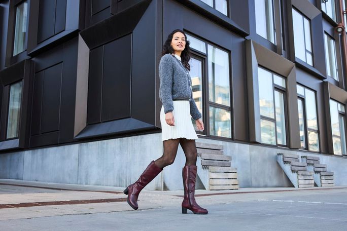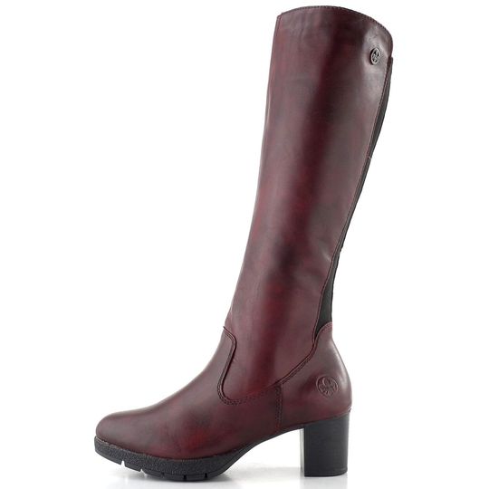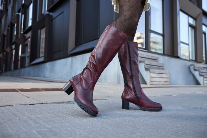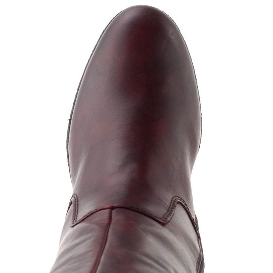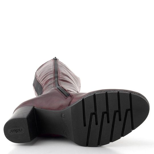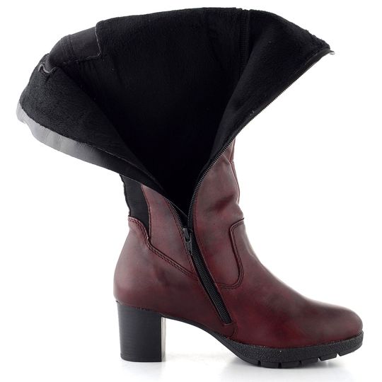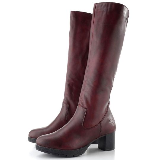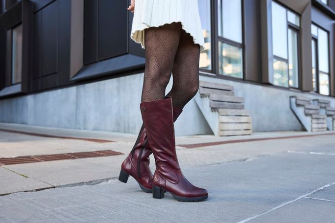 Dámské kozačky značky Rieker jsou ideální volbou pro chladné podzimní a zimní dny. Tyto vínové kožené kozačky s pružným lýtkem kombinují styl a komfort. Vyrobeny jsou z hladké kůže a disponují užší kulatou špičkou, což přidává na eleganci. Pro snadné obutí je na vnitřní straně umístěn zip. Široká pruženka na zadní straně zajišťuje pohodlné nošení a přizpůsobení se vašemu lýtku, které může být o 3 cm širší. Vnitřní teplá vlasová podšívka a vyjímatelná vložka s zesílenou patou zaručují maximální komfort. S výškou 38 cm a stabilním 6 cm podpatkem se skvěle hodí do města i na formální příležitosti.