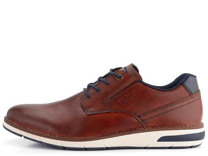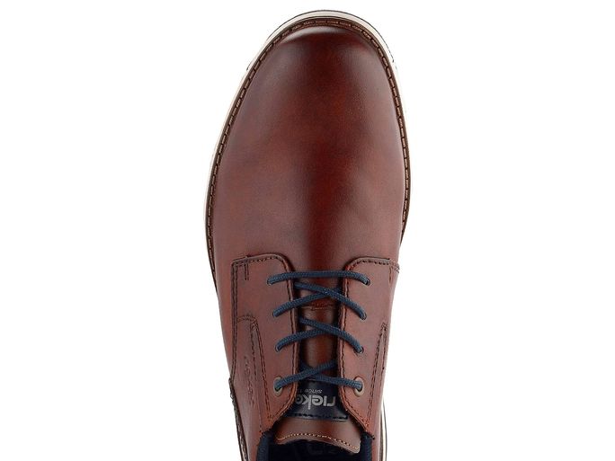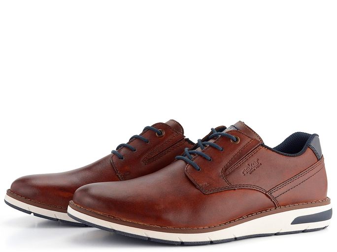 Pro muže, kteří ocení spojení elegance a komfortu, přináší značka Rieker pánské kožené polobotky v přírodním hnědém odstínu. Tyto boty vynikají sportovně elegantním střihem a šněrováním s kulatými tkaničkami. Vyrobeny jsou z hladké kůže v tmavém koňakově hnědém odstínu se stínováním, což dodává botám unikátní vzhled. Pro pohodlí je uvnitř textilní podšívka a měkká vyjímatelná stélka s textilním potahem. Podešev je z vícebarevného protismykového latexu, což zajišťuje bezpečný krok. Tmavě modré doplňky dodávají botám moderní nádech. Tyto polobotky jsou ideální volbou pro každodenní nošení do města i do kanceláře.
