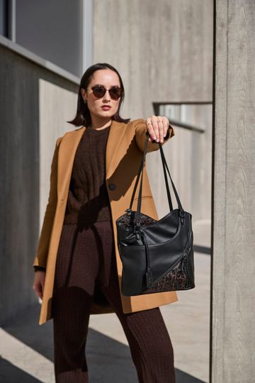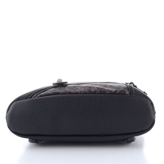 Praktická dámská kabelka v černé barvě se zvířecím vzorem, kterou lze nosit i jako batůžek na záda.