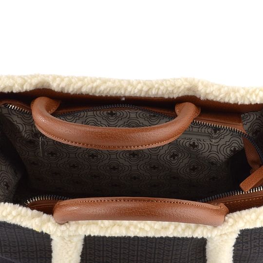 Originální dámská kabelka s potiskem a beránkovými lemy, s madly do ruky a odepínatelným popruhem přes rameno.