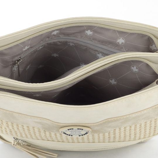 Zažijte styl a funkčnost s touto módní crossbody kabelkou od značky Rieker, ideální pro jarní a letní sezónu. Kabelka je vyrobena z kombinace hladké a metalické syntetiky spolu s vzorovanou textilií, což jí dodává jedinečný vzhled v krémových a metalických béžových tónech. Praktický a prostorný střih je doplněn funkčními kovovými zipy na přední straně a ramenním páskem s délkovou regulací, který umožňuje nosit kabelku klasicky i jako crossbody. Uvnitř najdete dvě zipové přihrádky pro organizaci vašich věcí. Rozměry kabelky jsou šířka 27 cm, výška 28,5 cm a hloubka dna 5,5 cm.