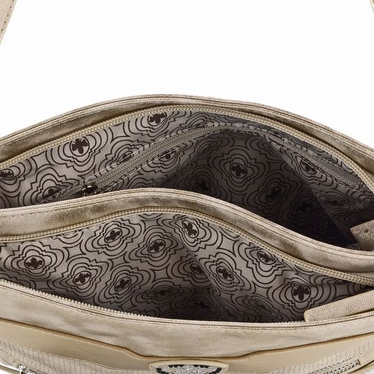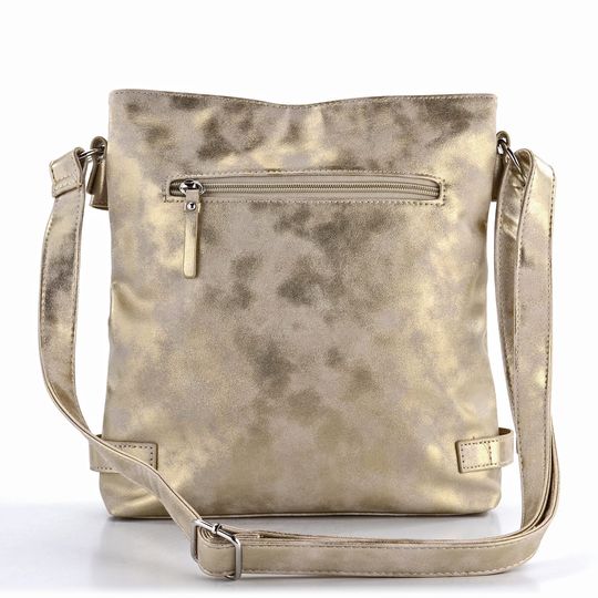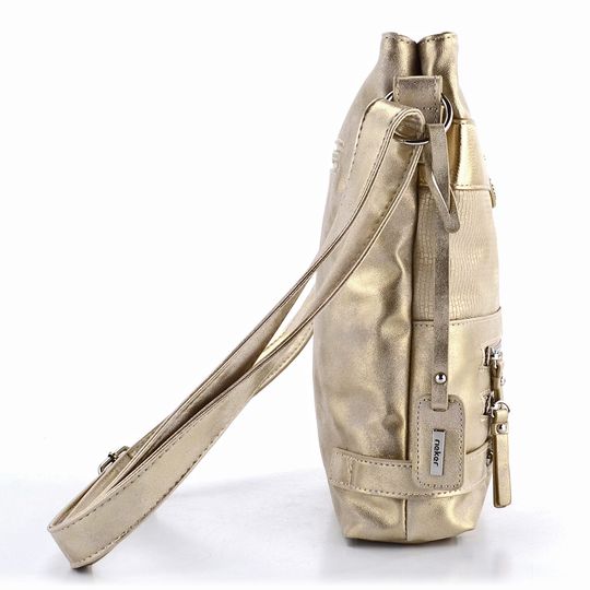 Elegantní a stylová crossbody kabelka od značky Rieker je ideální volbou pro každodenní nošení. Tato módní taška v sobě snoubí praktičnost a estetiku díky hladké a strukturované syntetice v jemném zlatém (platinovém) odstínu se stříbrnými doplňky. Kabelka je vybavena dvěma funkčními kovovými zipy na přední straně a nabízí dostatek prostoru pro vaše potřeby díky dvěma zipovým přihrádkám. V jedné naleznete dvě kapsičky na mobil a jiné drobnosti, ve druhé zipovou kapsičku na cennosti. Ramenní pásek s možností délkové regulace umožňuje nosit kabelku klasicky i jako crossbody. Zadní strana je opatřena pohotovostní kapsou. S rozměry 27 cm na šířku, 28,5 cm na výšku a hloubkou dna 5,5 cm je tato kabelka skvělým doplňkem pro každou příležitost.