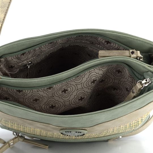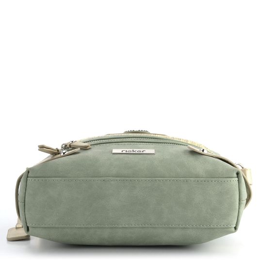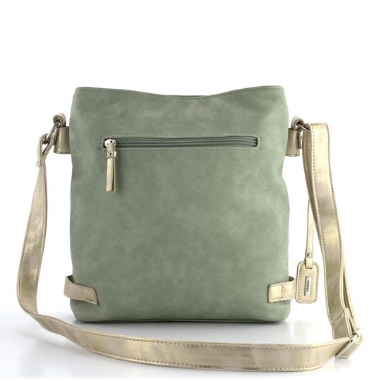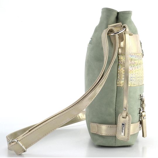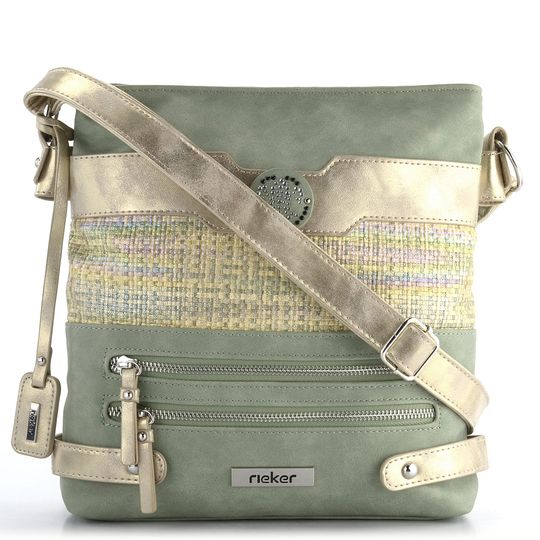 Elegantní a módní crossbody kabelka od značky Rieker v nádherných zeleno-zlatých tónech. Kabelka je vyrobena v praktickém a prostorném střihu, který je ideální pro každodenní nošení. Základní barva je mátově zelená s jemným stínováním, doplněná o kontrastní prvky ve světle zlaté barvě. Středový vzorovaný pruh přidává kabelce na originalitě díky svým duhovým odleskům při pohybu.