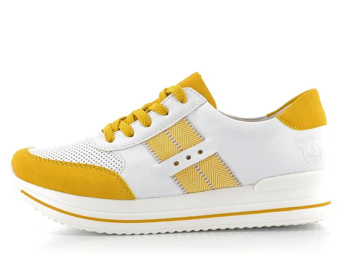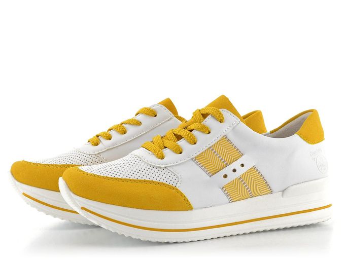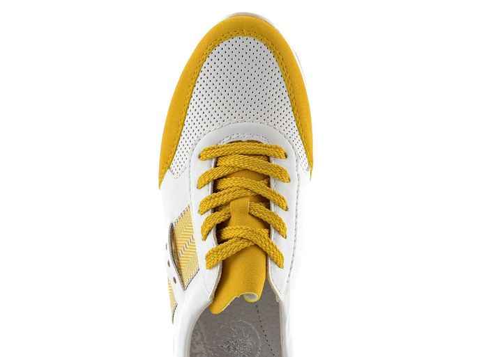Vstupte do světa elegance a komfortu s dámskými polobotkami na klínku od značky Rieker. Tato obuv vyniká trendy bílo-žlutou kombinací, která je ideální pro jarní a letní sezónu. Polobotky mají sportovnější střih a jsou vyrobeny ze syntetiky, což zaručuje jejich odolnost. Perforovaná špička a svěží žluté ploché tkanice dodávají botám jedinečný vzhled. Vyjímatelná stélka s koženým potahem zajišťuje maximální pohodlí při každém kroku. Podešev je také syntetická a díky vyšší platformě (3,5 cm) vypadají polobotky na noze velmi hezky. Tato obuv je ideální volbou pro každou ženu, která hledá styl a komfort v jednom.