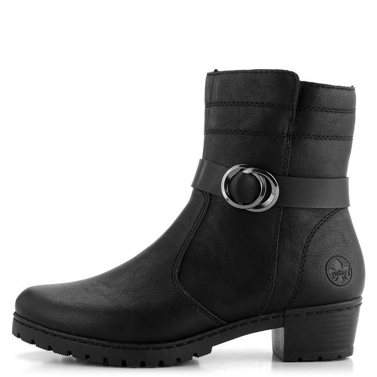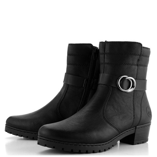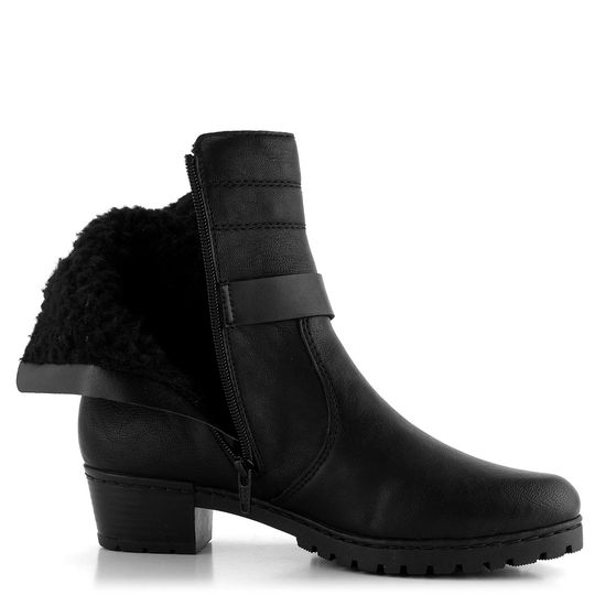 Elegantní a pohodlné – to jsou dámské zimní kotníčkové boty od značky Rieker. Tyto boty jsou ideální volbou pro podzimní a zimní sezónu. Vyrobeny ze strukturované syntetiky v černé barvě, nabízejí mírnou variabilitu obvodu díky překladu na vnější straně. Snadné obutí zajišťuje zip na vnitřní straně. Uvnitř najdete velmi teplou podšívku z umělého beránku, která vás udrží v teple i v chladných dnech. Stélka s filcovým potahem a lehká podešev s hrubším vzorkem poskytují maximální komfort a stabilitu. Boty mají elegantní tvar špičky a 4 cm vysoký podpatek, který dodává na ženskosti. Díky šitému výrobnímu způsobu jsou tyto boty velmi pohodlné a flexibilní, i když nezaručují vodotěsnost. Pro zvýšení odolnosti vůči vlhku doporučujeme použít vhodné impregnační přípravky. Perfektní volba pro každou ženu, která hledá stylovou a pohodlnou obuv do města či kanceláře.