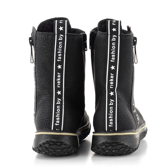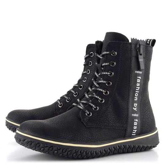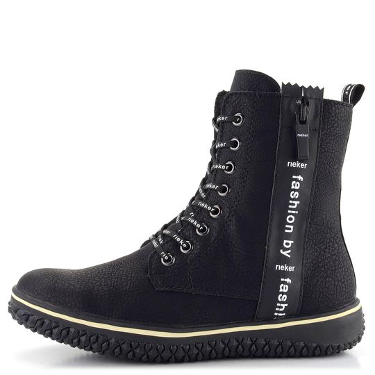 Pro ženy, které hledají pohodlí a styl během podzimních a zimních měsíců, jsou kotníkové boty značky Rieker ideální volbou. Tento model v černé barvě zaujme sportovnějším střihem a dezénovaným syntetickým svrškem. Ozdobný pogumovaný zip s nápisem značky na vnější straně dodává botám moderní vzhled, zatímco potištěná léga v zadní části a šněrování s potištěnými tkaničkami podtrhují jejich jedinečnost.