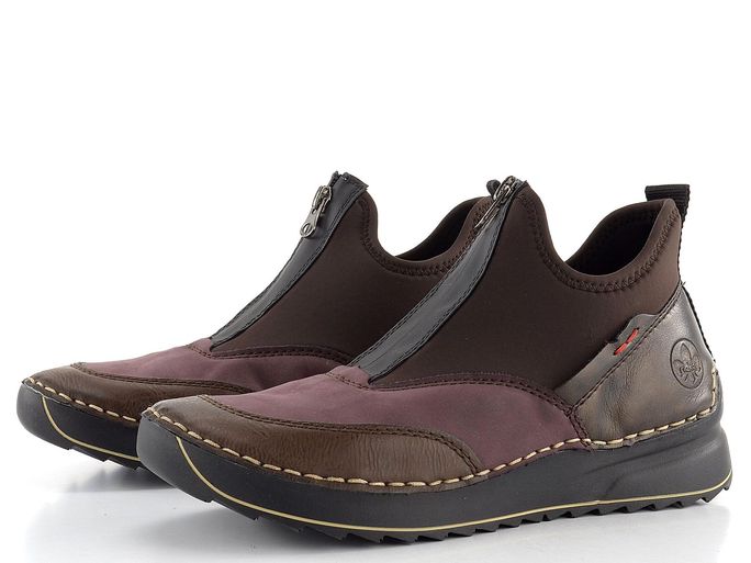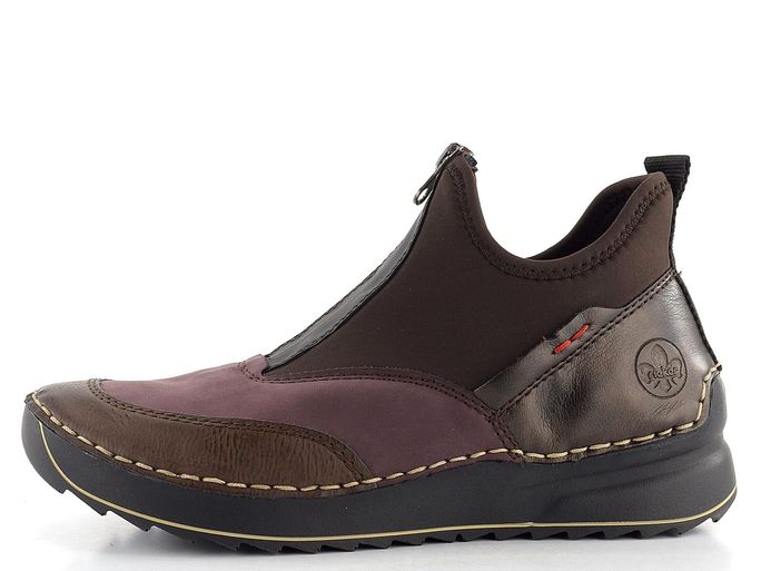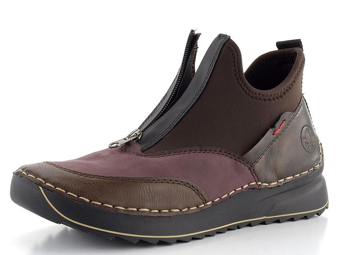 Vyberte si pohodlí a styl s dámskými kotníkovými botami od značky Rieker. Tento model zaujme originální barevnou kombinací tmavé bordó, hnědých odstínů, metalické a černé barvy. Boty jsou vyrobeny z kombinace syntetiky a pružné textilie, což zajišťuje pohodlí a flexibilitu. Prostorný kulatý střih je ideální i pro mírně širší chodidla. Místo šněrování je zde praktický zip na nártu, který umožňuje rychlé a pohodlné obutí. Uvnitř najdete měkkou textilní podšívku a extra měkkou filcovou stélku, která poskytuje teplo a pohodlí. Pohodlná vyšší podešev s protiskluzovým pilkovitým vzorkem zajišťuje bezpečný krok. Výška kotníku je 9 cm (bez podešve). Tento model je ideální pro podzimní a zimní sezónu, přičemž doporučujeme použití impregnačních přípravků pro zvýšení odolnosti vůči vlhku. Dopřejte si kvalitu a komfort s botami od značky Rieker.