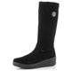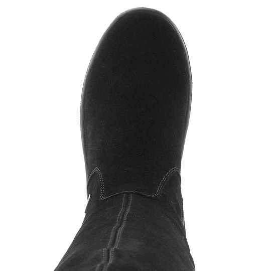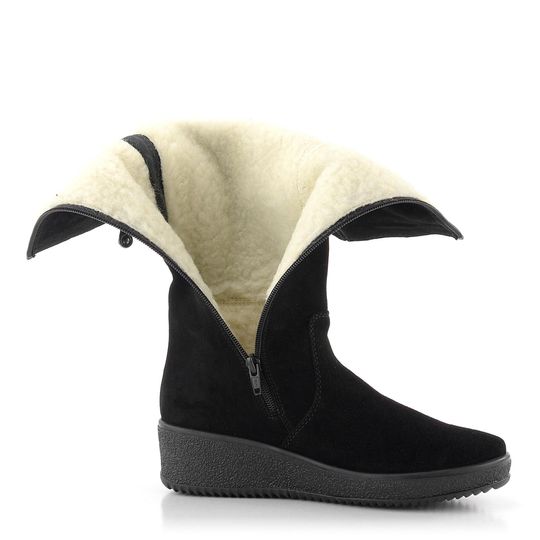 Dámské semišové kozačky na nižším klínku s vlněnou podšívkou a zadním zipem určeným pro regulaci lýtkového obvodu.