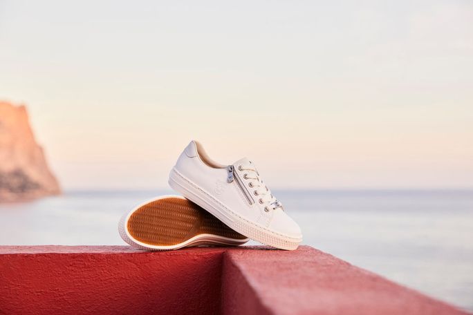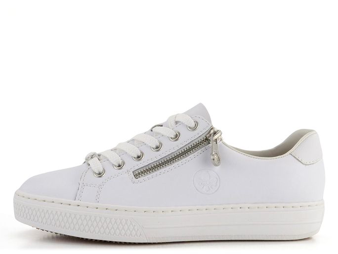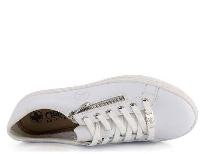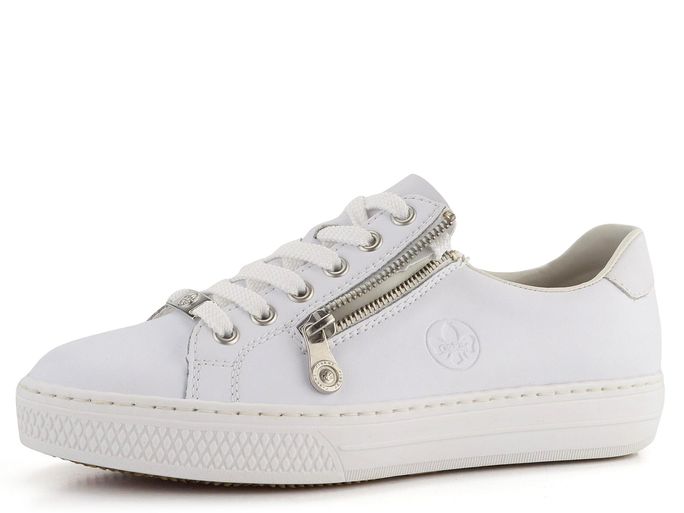 Stylové dámské kožené polobotky - tenisky od značky Rieker jsou ideální volbou pro každodenní nošení. Tyto tenisky se vyznačují prostornou kulatou špičkou a hladkou povrstvenou kůží na svrchním dílci. Elegantní bílá barva je doplněna kováním ve stříbrné barvě, což dodává obuvi moderní vzhled.
