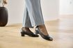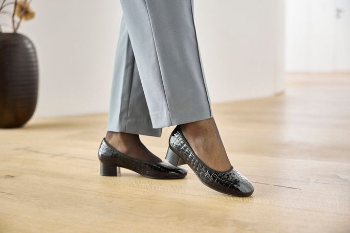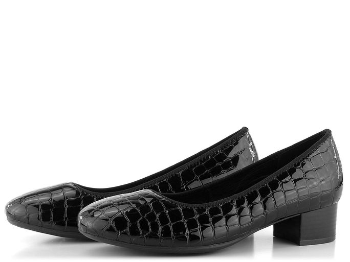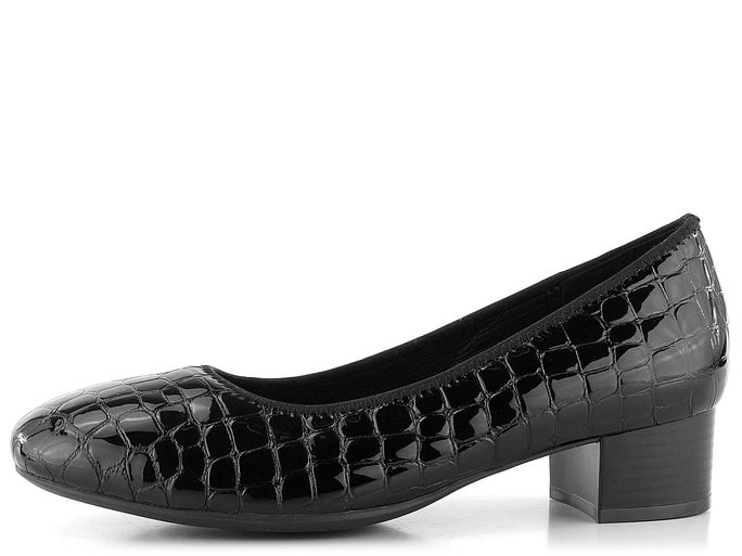 Velice pohodlné dámské lodičky z černé lakované kůže s kroko vzorem.