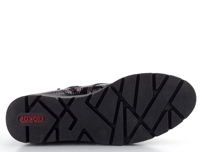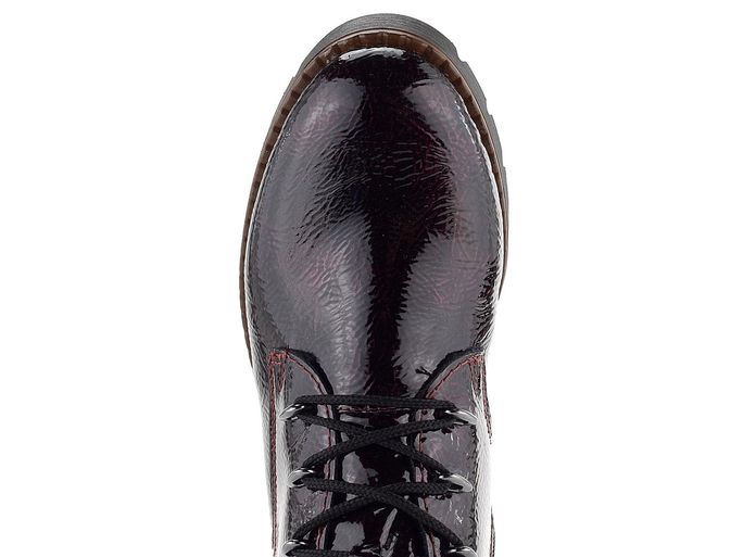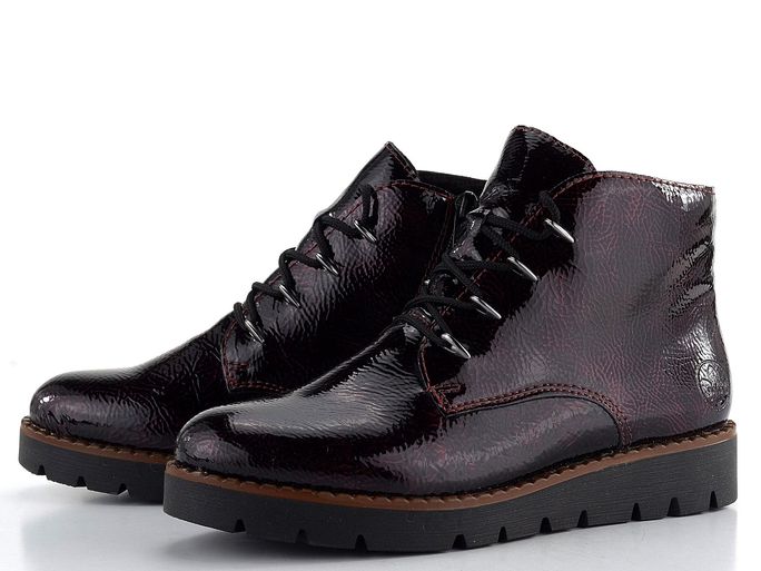 Komfortní dámské kotníkové boty na podzim a zimu od značky Rieker přinášejí skvělý design a pohodlí. Boty jsou vyrobeny z lakované, jemně mačkané syntetiky v krásném odstínu temné vínově fialové (bordeaux) barvy. Díky kulatému střihu a šněrování s designovými kovovými průvlaky a kulatými tkaničkami se snadno přizpůsobí každému chodidlu.