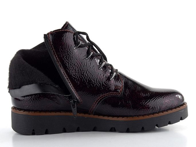 Dámský kotníček v lakovaném vínovém provedení, s teplou podšívkou a měkkou vyjímatelnou vložkou.