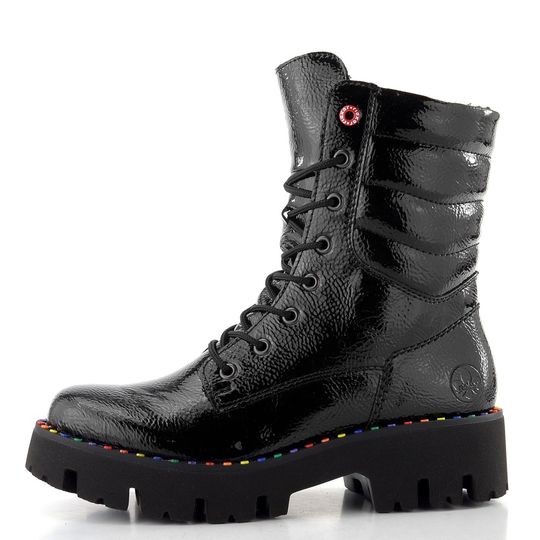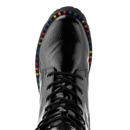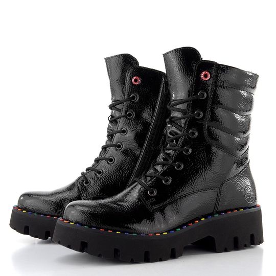 Robustní dámský lakovaný kotník od značky Rieker je ideální volbou pro chladné podzimní a zimní dny. Jeho prostorný, kulatý střih zajišťuje pohodlí, zatímco svršek z mačkané lakované syntetiky v černé barvě, oživené barevnými puntíky na rámu podešve, dodává botám stylový nádech.