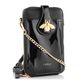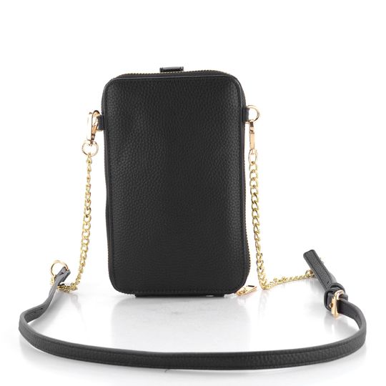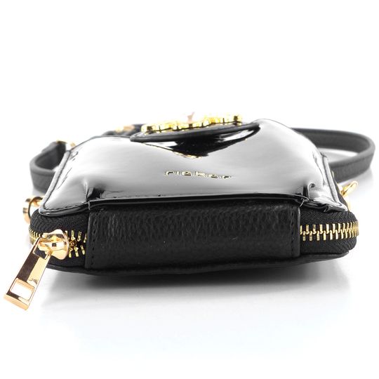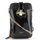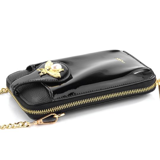 Stylová dámská crossbody kabelka/pouzdro na telefon v černém lakovaném provedení s ozdobnou broží.