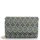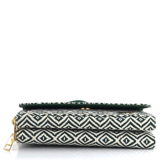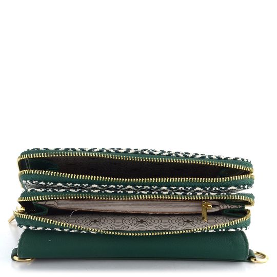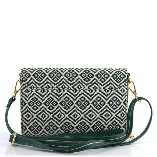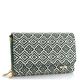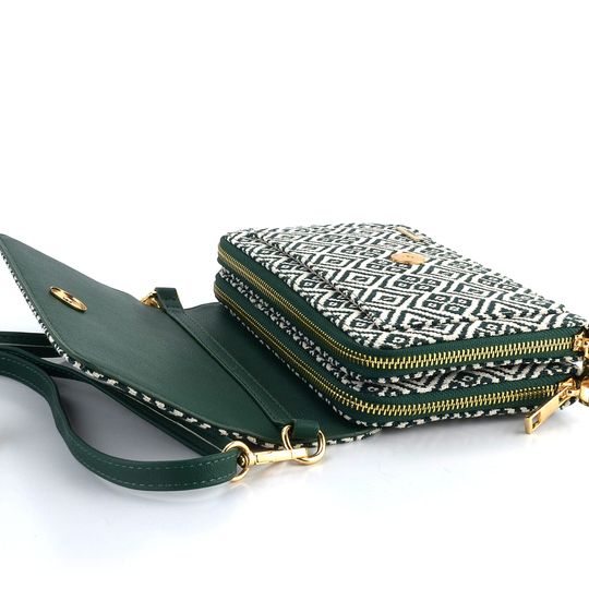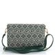 Malá dámská kabelka v bílo-zelené barevné kombinaci s vytkávaným vzorem a odepínatelným ramenním páskem.