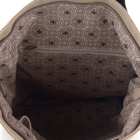 Vnitřní výbava zahrnuje zipovou kapsičku na cennosti a dvě otevřené kapsičky na klíče či mobil. Látkové ramenní pásky s délkovou regulací a poutko na zavěšení přidávají na komfortu. Rozměry batohu: horní šíře 38 cm, výška 38 cm, hloubka dna 10,5 cm. Tento batoh z kolekce jaro/léto 2023 je skvělým doplňkem pro každodenní nošení.