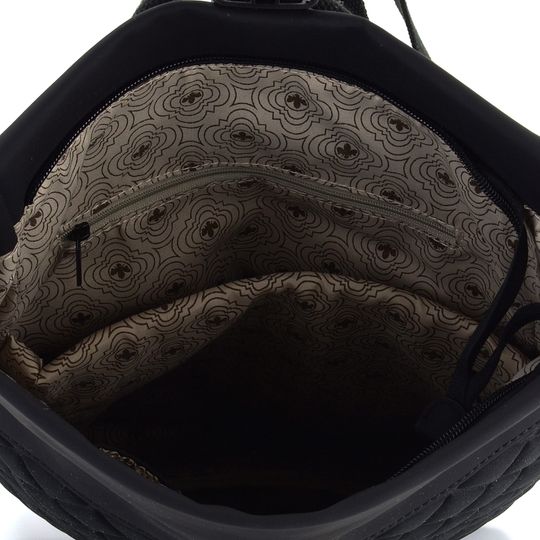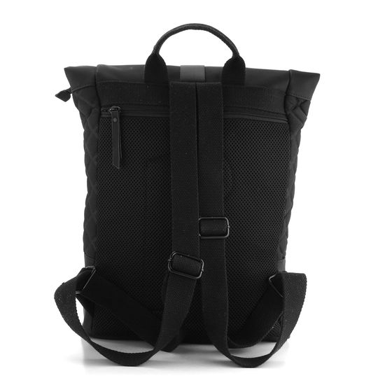 Batoh zaujme ozdobným vytlačovaným vzorem kosočtverců a elegantní černou barvou. Na zadní straně najdete velkou zipovou kapsu, která je polstrovaná pro bezpečné uložení vašich cenností. Hlavní komora se zapíná na plastovou batohovou sponu a pod ní je ještě zip pro větší bezpečnost.