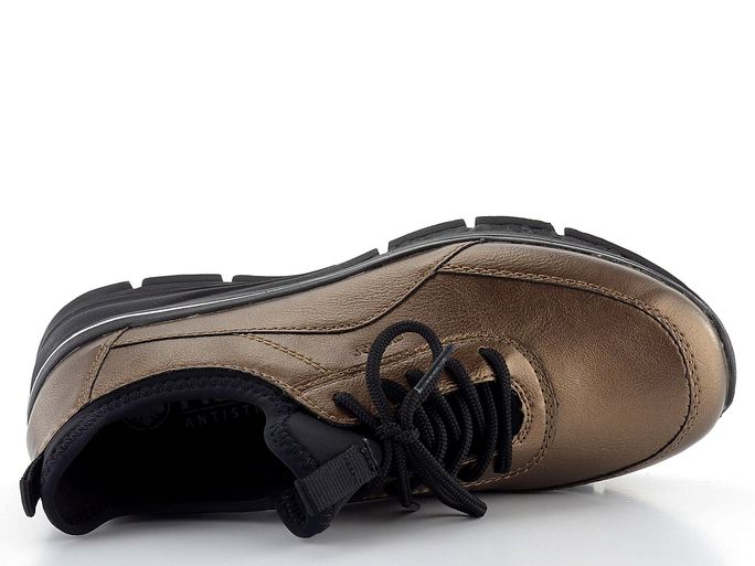 Dámské prozouvací metalické polobotky od značky Rieker jsou ideální volbou pro podzimní a zimní sezónu. Tyto boty vynikají svým kulatým střihem špičky a svrškem z metalické syntetiky kombinované s textilním lemem, což zajišťuje nejen elegantní vzhled, ale i pohodlí při nošení. Bronzová barva s černými doplňky dodává botám moderní a stylový vzhled.