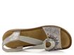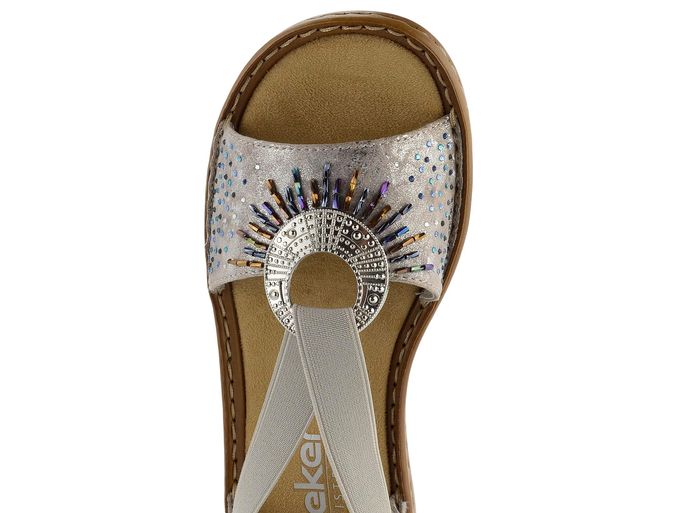 Elegantní a pohodlné dámské sandály od značky Rieker jsou skvělou volbou pro jarní a letní sezónu. Tyto sandály kombinují matnou syntetiku s metalickým leskem v šedo-stříbrné barvě, což jim dodává jedinečný vzhled. Přední pásek je zdoben bižuterními kamínky v odstínech modré, fialové, zelené a měděné barvy, které spolu s výraznou kovovou ozdobou na nártu dodávají obuvi šmrnc.