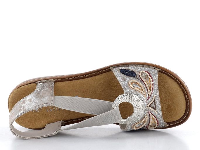 Zažijte pohodlí a styl s dámskými sandály od značky Rieker. Tyto sandály spojují autentický design a trvalou kvalitu, ideální pro jarní a letní sezónu. Svršek z matné syntetiky s metalickým leskem v šedo-stříbrné barvě dodává botám elegantní vzhled. Přední pásek je zdobený výšivkou s korálkovou a flitrovou aplikací, což přidává na originalitě. Pružný nártový pásek usnadňuje obutí a zajišťuje pohodlí při nošení. Díky extra měkké stélce a lehké, flexibilní podešvi s podpatkem 3,5 cm jsou sandály skvělou volbou pro město i kancelář. Respekt k životnímu prostředí je pro nás důležitý, a proto nabízíme obuv, která je nejen stylová, ale také odpovědná.