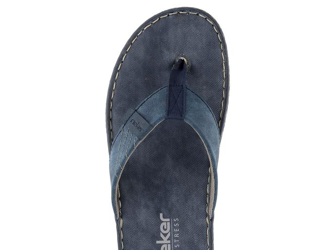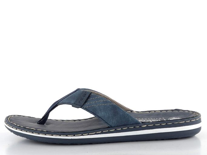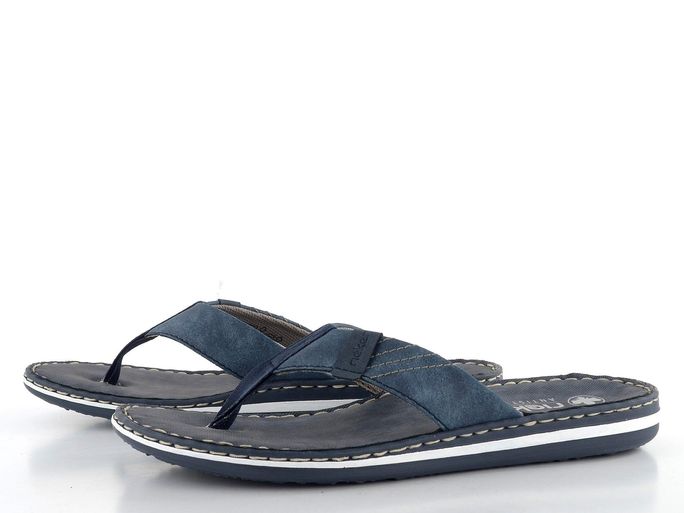 Pánské žabky od značky Rieker přinášejí kombinaci stylu a komfortu, ideální pro letní dny. Tyto sandály v stínované modrošedé jeans barvě se vyznačují kulatou špičkou a nártovým páskem z matné syntetiky. Pásek mezi prsty je textilní, což zajišťuje pohodlí při nošení. Textilní podšívka a příjemně měkká stélka se syntetickým potahem přidávají na komfortu. Podešev je velmi ohebná, což zaručuje pohodlí při každém kroku. Díky šitému výrobnímu způsobu jsou tyto žabky nejen stylové, ale i odolné. Jsou ideální volbou pro muže, kteří hledají kvalitní obuv pro teplé sezóny.