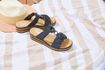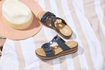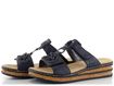 Dámské tmavě modré pantofle s upínacími pásky a na vyšší platformě s klínkem.