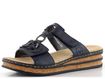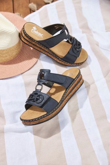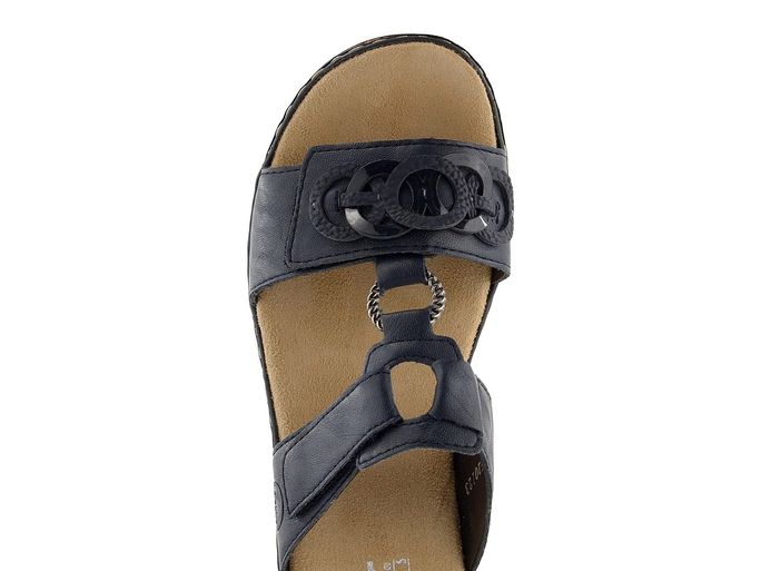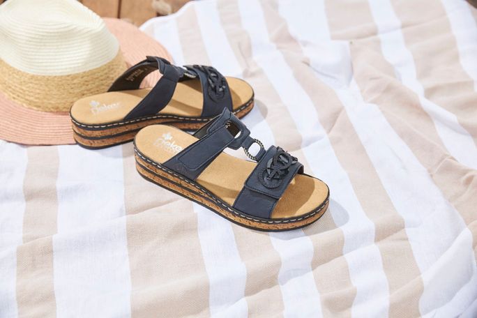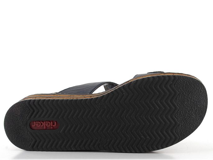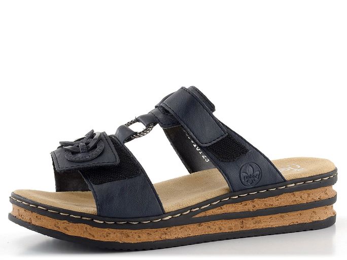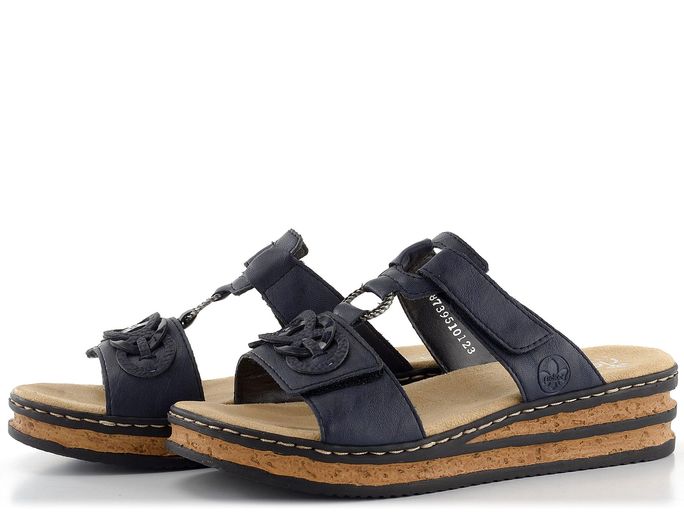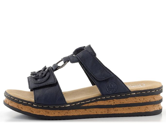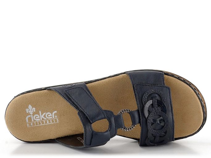 Dámské pantofle značky Rieker jsou ideální volbou pro jarní a letní sezónu. Tyto pantofle vynikají komfortním střihem a temně modrou barvou, která je snadno kombinovatelná s různými outfity. Svršek je vyroben z lehce mačkané syntetiky, což dodává botám moderní vzhled. Oba pásky jsou upínané na suchý zip, což umožňuje snadné a rychlé obouvání, a jsou spojeny ozdobným kovovým kroužkem, který přidává na eleganci.