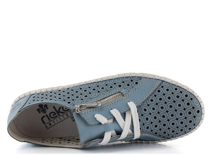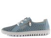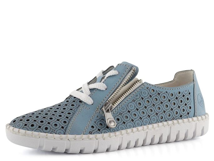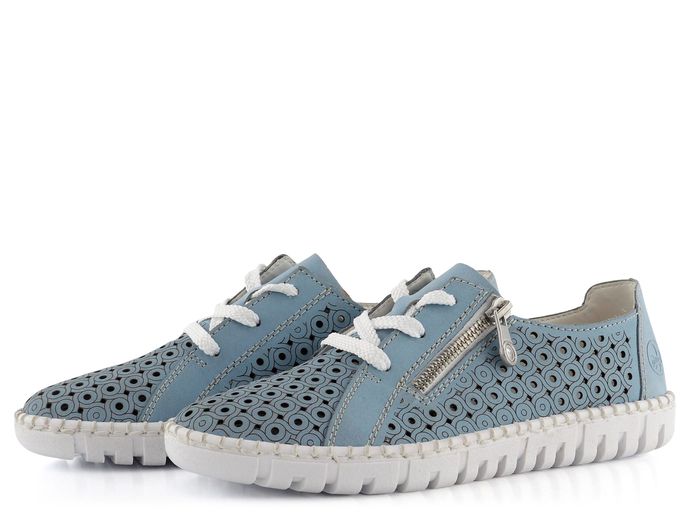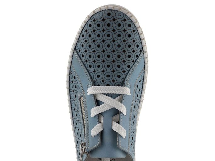 Dámské polobotky z kůže ve světle modré barvě, s ozdobným prořezávaným vzorem a funkčním postranním zipem.