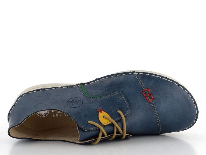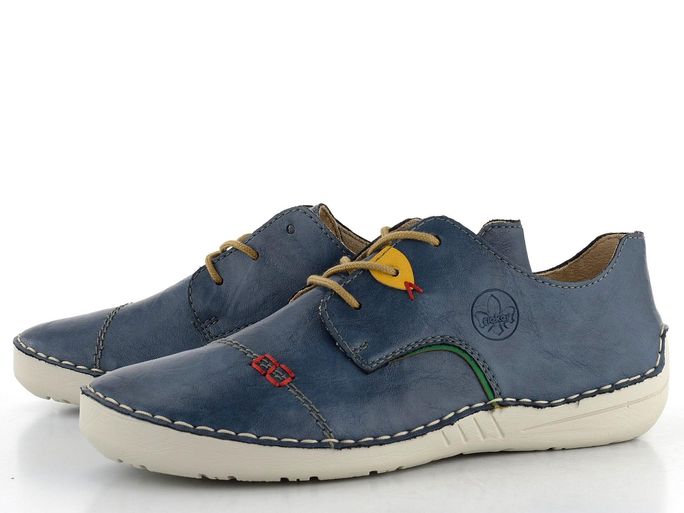 Dámské polobotky od značky Rieker představují ideální volbu pro ty, kdo hledají styl a pohodlí v jednom. Modrá barva s jemnou mačkanou strukturou a veselé barevné prvky v červené, žluté a zelené barvě dodávají botám hravý vzhled, který oživí každý outfit. Prostorný, kulatý střih zajišťuje komfort i při celodenním nošení. Svršek z kvalitní syntetiky doplňuje extra měkká stélka s celokoženým potahem, která poskytuje maximální pohodlí. Lehkou a flexibilní podešev oceníte při každém kroku. Díky šití zůstávají boty pohodlné a flexibilní, i když nejsou vodotěsné. S těmito polobotkami budete připraveni na každou městskou výzvu.