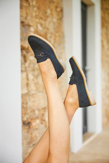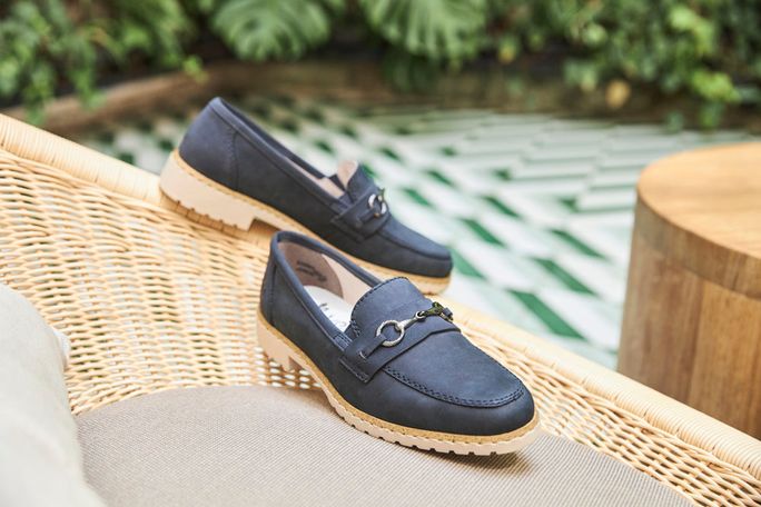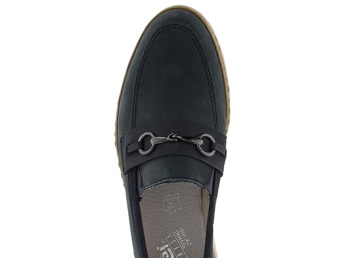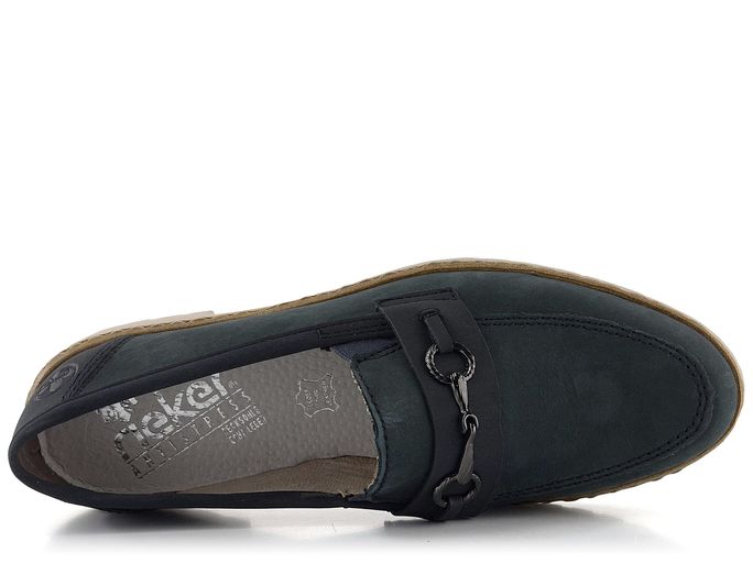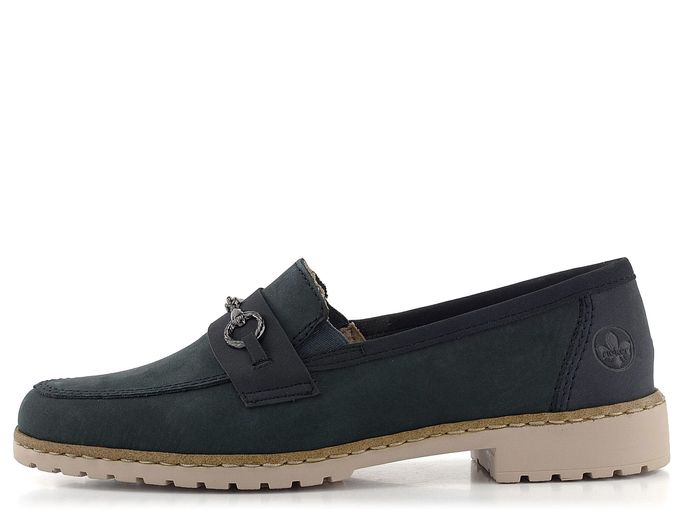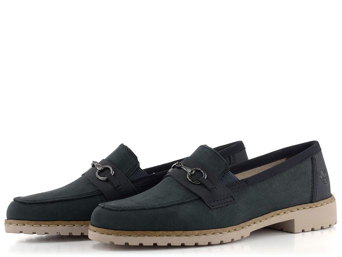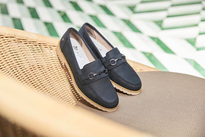 Pohodlné dámské mokasíny od značky Rieker z kolekce jaro/léto 2023. Tyto mokasíny jsou ideální volbou pro každou ženu, která hledá stylovou a zároveň komfortní obuv. Mokasíny jsou vyrobeny z kombinace nubukové kůže a matné syntetiky, což zajišťuje jejich dlouhou životnost a elegantní vzhled. Temně modrá barva dodává botám nadčasový šarm. Na nártu je ozdobný pásek s kovovou aplikací, který dodává botám jedinečný vzhled. Pro snadné obutí a pohodlné nošení mají mokasíny po stranách všité pruženky. Uvnitř najdete textilní podšívku a měkkou koženou stélku, které společně zajišťují maximální komfort při každém kroku. Zpevněný vnitřní opatek a velmi lehká syntetická podešev s nízkým podpatkem (3 cm) a hrubším vzorkem přispívají k celkovému pohodlí a stabilitě. Mokasíny jsou šité, což zvyšuje jejich flexibilitu, ale nezaručuje vodotěsnost. Pro vyšší odolnost vůči vlhku doporučujeme použít vhodné impregnační přípravky. Tato obuv je ideální pro městské prostředí, lehké procházky i do kanceláře.