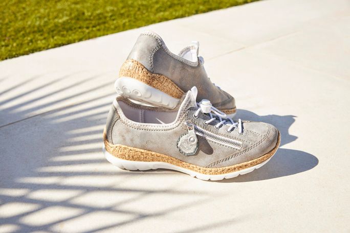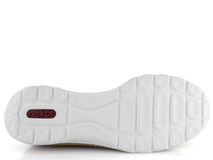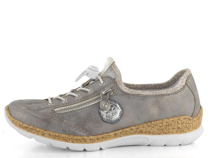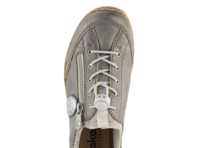 Dámské polobotky značky Rieker vynikají módním metalickým designem a komfortem, který oceníte v každodenním městském prostředí. Tyto boty kombinují ležérní prozouvací střih s kulatou špičkou a svršek z jemně strukturované syntetiky s pružnou softshellovou textilií. Stínovaná šedá barva s metalickým leskem je doplněna bílými a stříbrnými detaily, které dodávají botám moderní vzhled. Pružná bílá gumička na nártu zajišťuje snadné přizpůsobení, zatímco extra měkká stélka z pamětové pěny poskytuje maximální pohodlí. Šitý výrobní způsob zajišťuje flexibilitu, ideální pro suché prostředí.