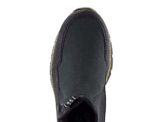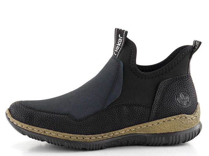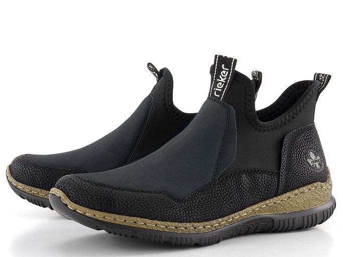 Ležérní dámské kotníkové boty od značky Rieker jsou ideální volbou pro podzimní a zimní sezónu. Boty jsou vyrobeny z kombinace matné a strukturované syntetiky s pružnou softshellovou textilií, což zajišťuje pohodlí i při delším nošení. Černý základ je doplněn tmavým šedomodrým odstínem, který dodává botám elegantní vzhled. Díky pružnému kotníkovému lemu s poutky je obutí snadné a rychlé. Uvnitř bot najdete lehce polstrovanou textilní podšívku a měkkou stélku z paměťové pěny, která se přizpůsobí tvaru vaší nohy. Flexibilní syntetická podešev zajišťuje pohodlný krok. Boty jsou šité, což zvyšuje jejich flexibilitu, avšak nezaručuje vodotěsnost. Pro zvýšení odolnosti vůči vlhku doporučujeme použít vhodné impregnační přípravky. Tento model je ideální do suchého prostředí.