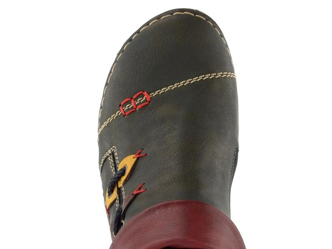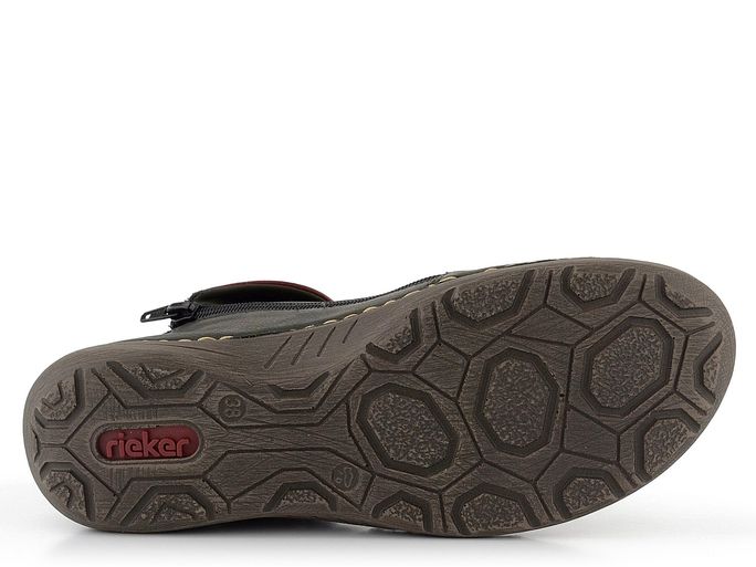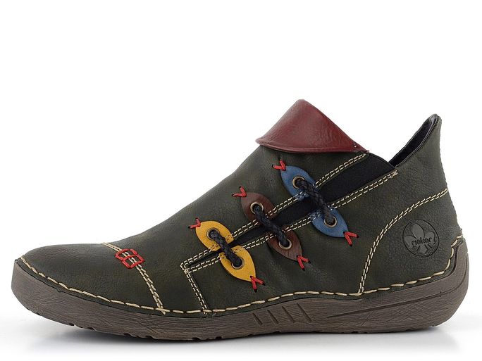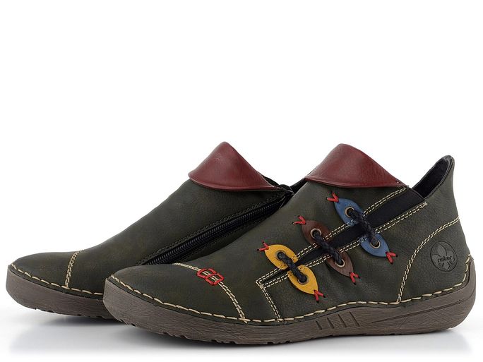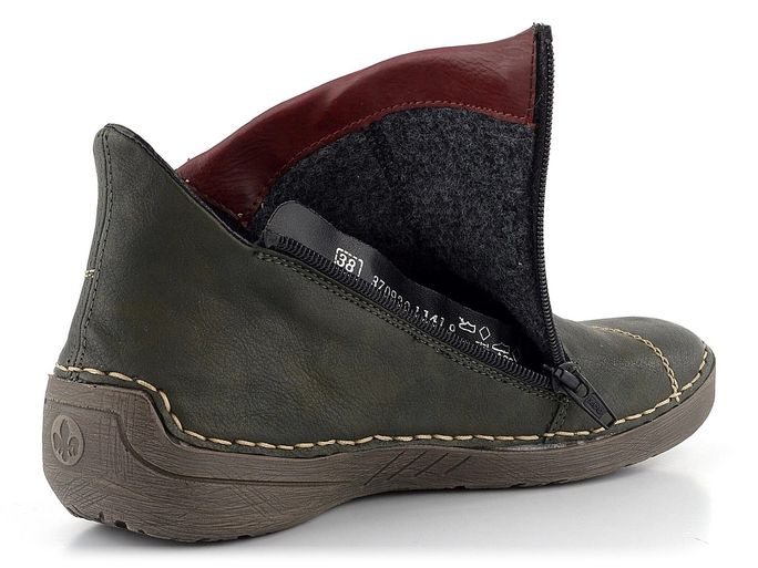 Ležérní dámské kotníkové boty od značky Rieker jsou ideální volbou pro podzimní a zimní sezónu. Tyto boty zaujmou tmavě zelenou barvou s barevnými doplňky ve vínové, žluté, modré a hnědé barvě, což dodává vašemu outfitu jedinečný vzhled. Vyrobeny z hladkého syntetického materiálu, nabízejí lehkou šitou konstrukci a prostorný střih s kulatou špičkou. Na vnitřní straně najdete zip pro snadné obutí, zatímco na vnější straně je všita pružná vsadka. Mírně zateplený vnitřek s filcovou podšívkou a měkkou stélkou s filcovým potahem zajistí vaše pohodlí. Flexibilní syntetická podešev a 3 cm vysoký podpatek doplňují celkový komfort. Doporučujeme používat obuv především v suchém prostředí a zvýšit odolnost vůči vlhku vhodnými impregnačními přípravky.